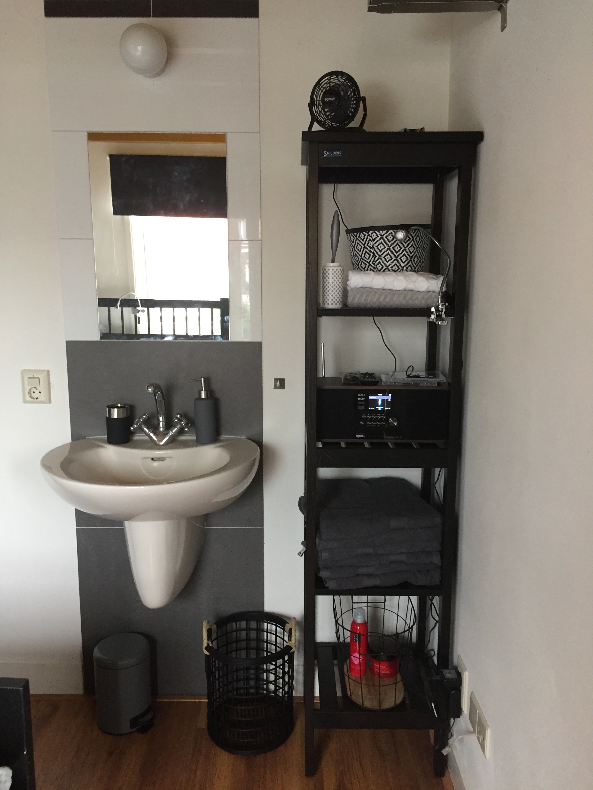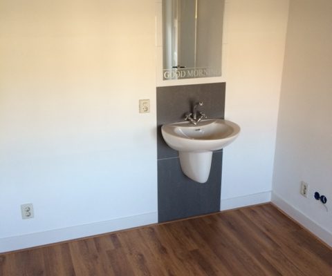 This student room is fully equipped with a neat laminate floor and has its own sink.