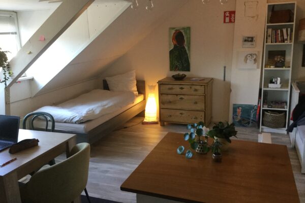 Deze ruime kamer van 30m2 wordt gemeubileerd opgeleverd (1 bed, 1 tafel en 2 stoelen)